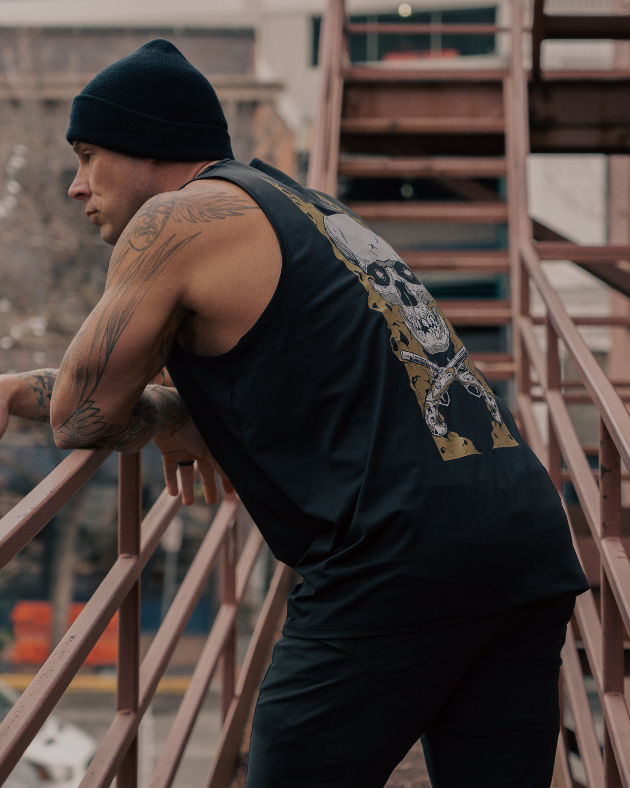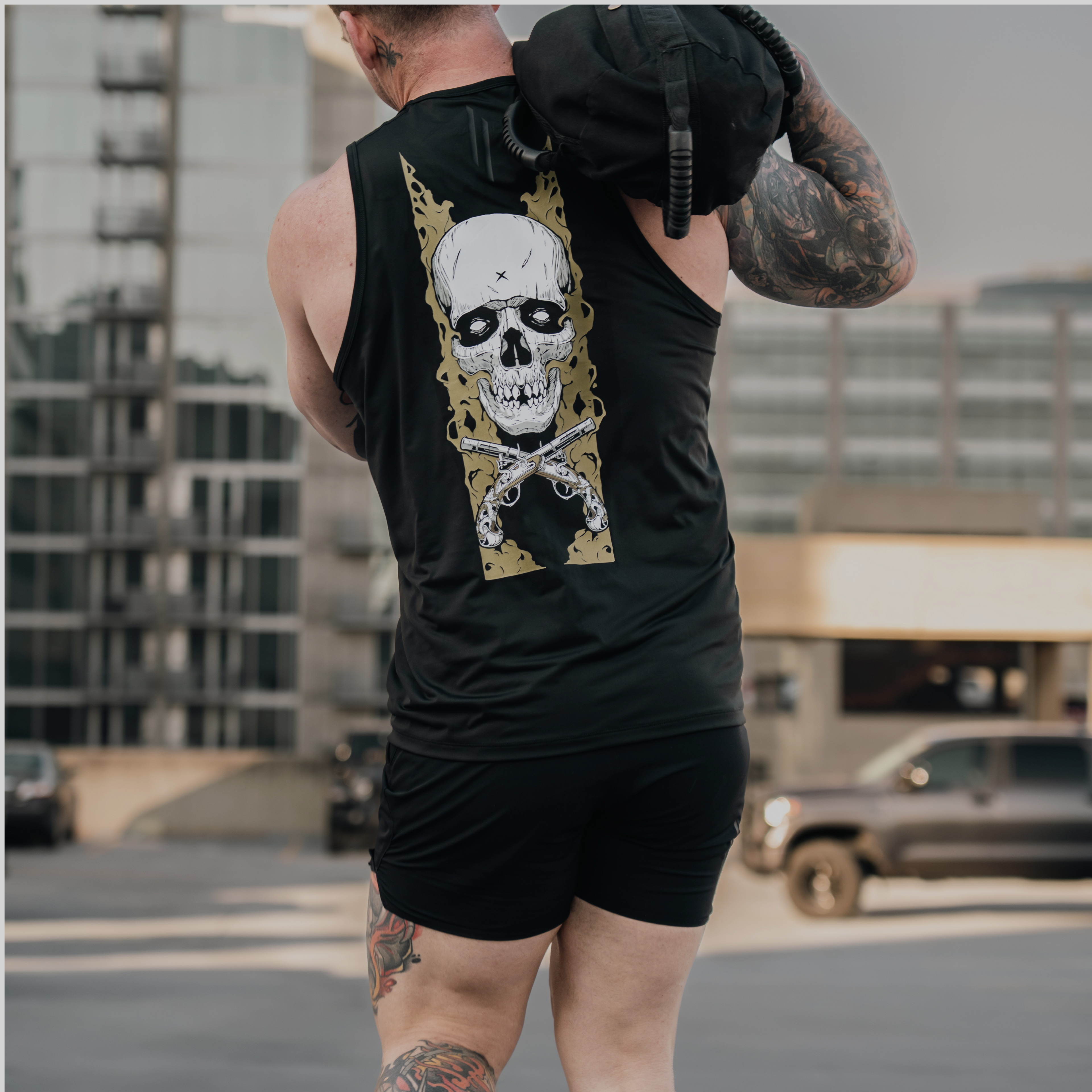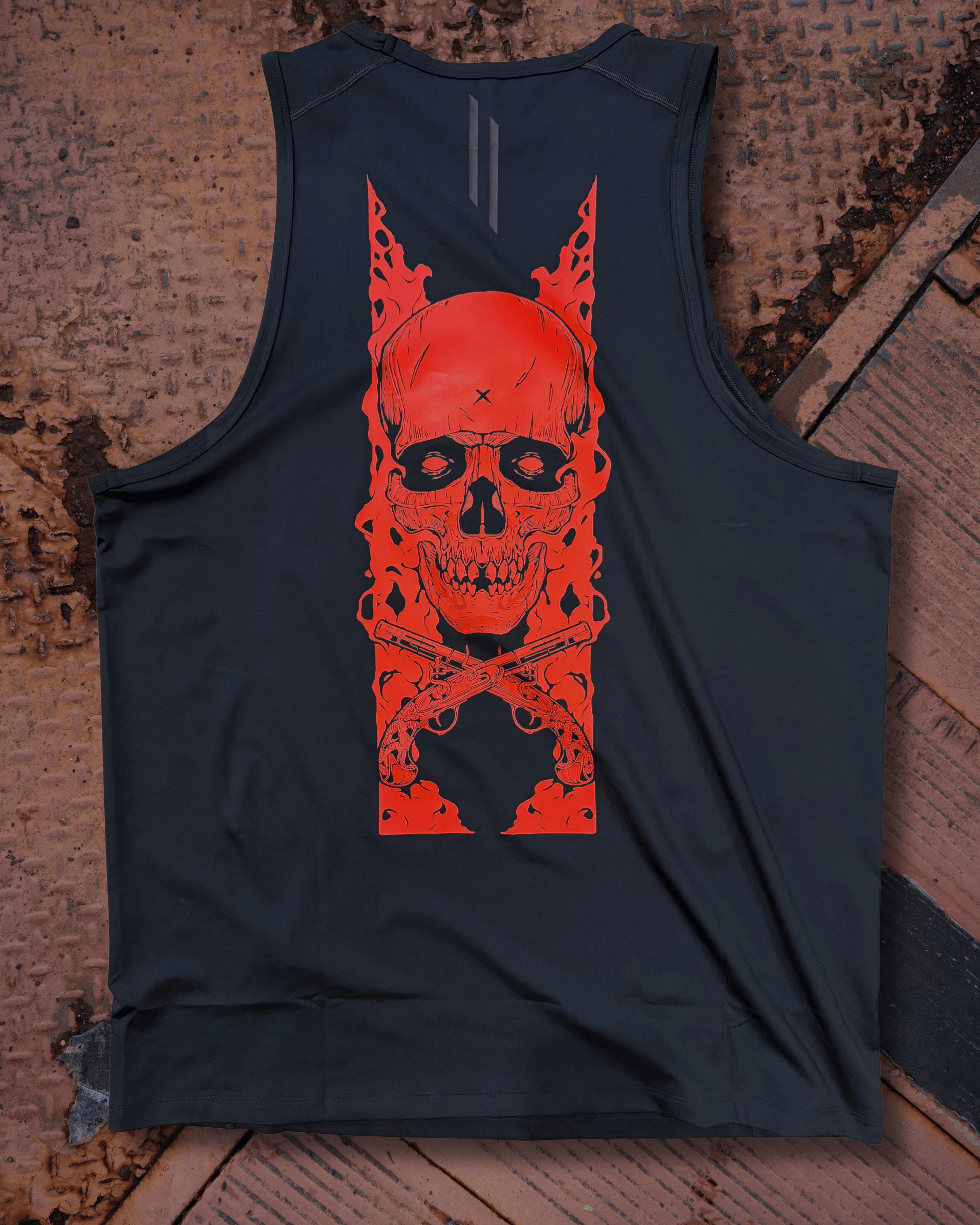 Printed on our classic Baseline tank that's built for endurance. Paired with the skull and flintlocks, your workout just became ruthless.